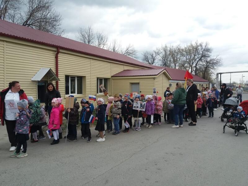 5 мая прошла торжественная линейка ко Дню Победы. Воспитанники всех возрастных групп вышли на улицу в пилотках, с георгиевскими ленточками и цветами, с портретами своих прадедов.