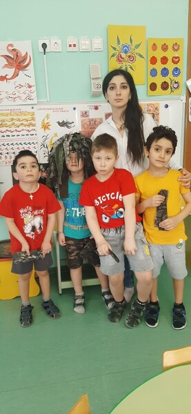 Следующим важным делом для юных волонтёров стало изготовление лент для маскировочных касок солдат. Предварительно волонтёрами из российского Движения детей и молодёжи техникума «ЕТОТС» для дошкольников был проведён мастер-класс, где дети нарезали ленты из камуфляжного материала.